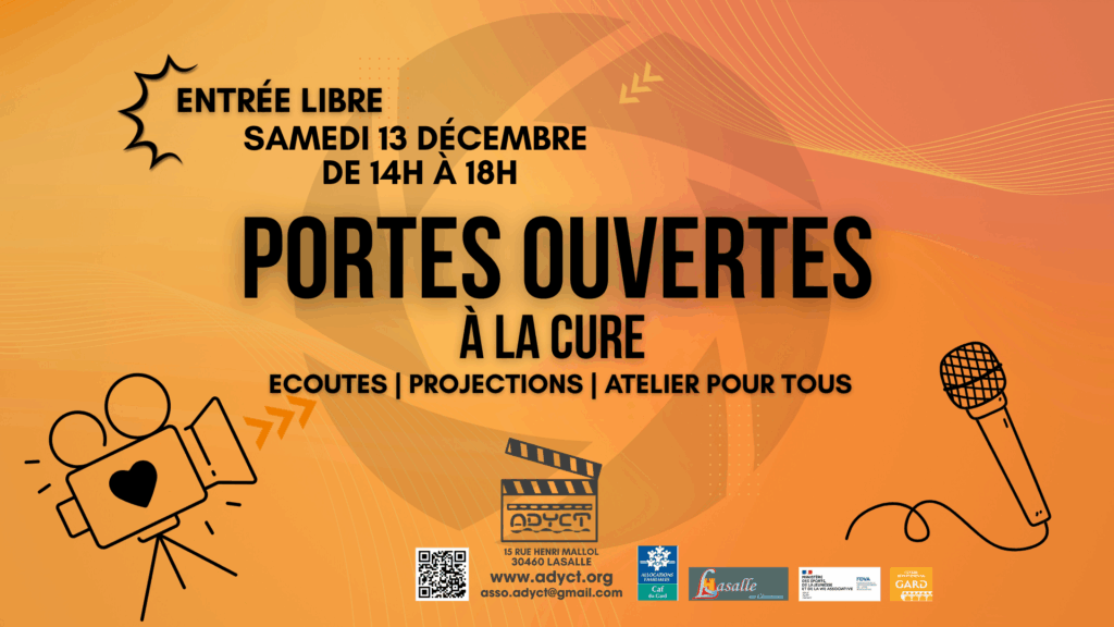 Pour cette troisième édition de la “Journée Portes Ouvertes à la Cure”, ADyCT ouvre les portes de La Cure pour un après-midi de découvertes : écoutes, projections et atelier interactif autour des créations menées avec les enfants et les habitant·es. De 14h à 17h, chacun·e est invité·e à parcourir et écouter les productions, avant de partager un moment convivial avec l’équipe autour d’un chocolat chaud et d’un vin chaud.